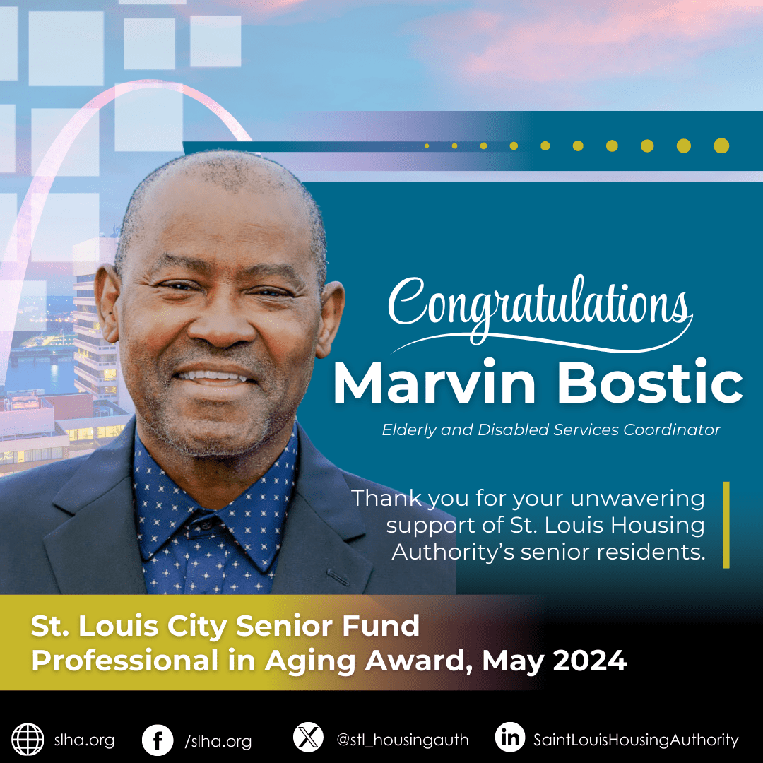 Join us in celebrating SLHA’s Elderly and Disabled Services Coordinator Marvin Bostic, who was recently honored with the 2024 Professional in Aging Award by the St. Louis City Senior Fund. Marvin’s dedication and invaluable contributions have empowered SLHA’s senior residents to live with choice and independence, making a profound impact on their lives.