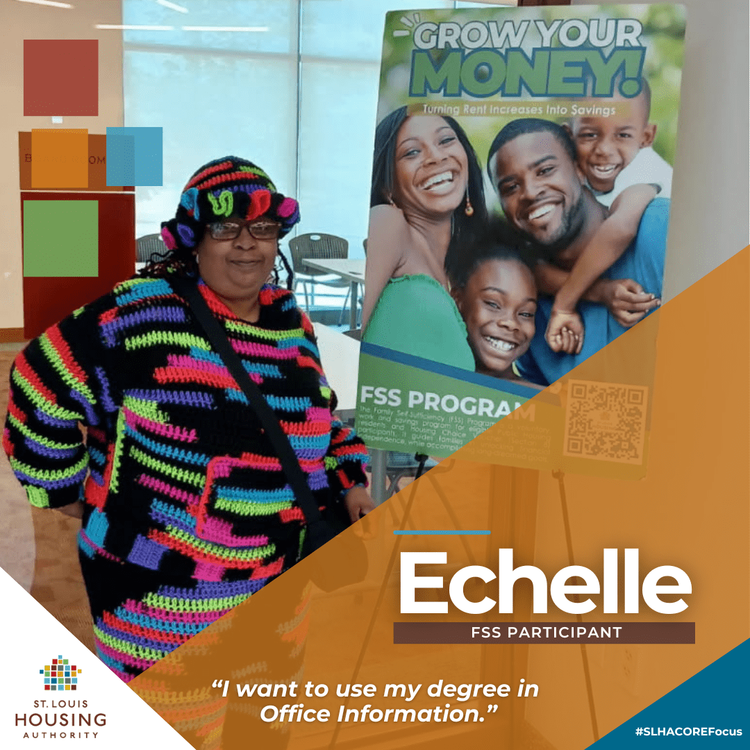 Through the Family Self-Sufficiency (FSS) program at SLHA, Echelle has been matched with valuable resources and support services that align with her personal and professional goals. The FSS team has helped her explore opportunities, improve her financial literacy, and stay focused on long-term stability.