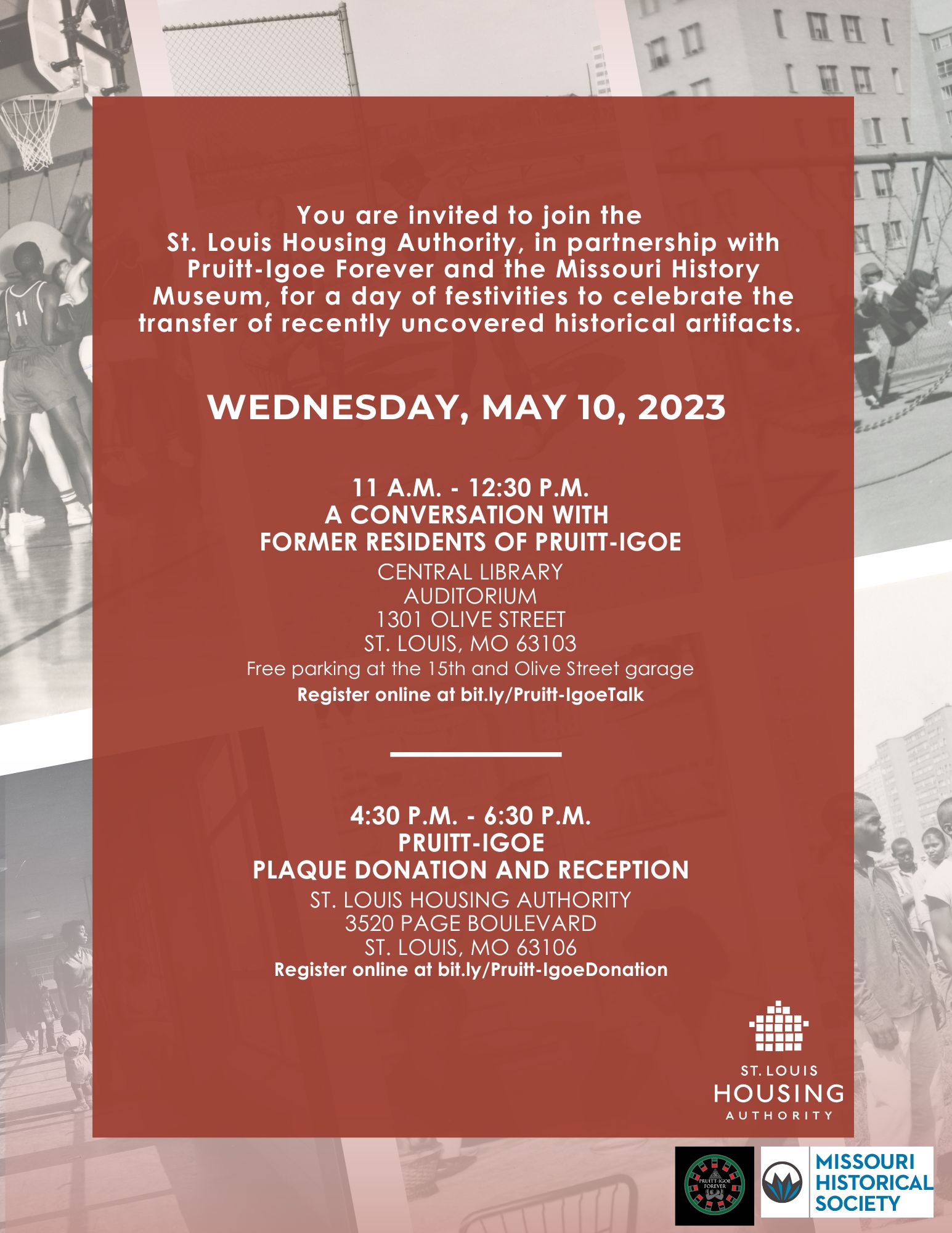 You are invited to join the St. Louis Housing Authority, in partnership with Pruitt-Igoe Forever and the Missouri History Museum, for a day of festivities to celebrate the transfer of recently uncovered historical artifacts.