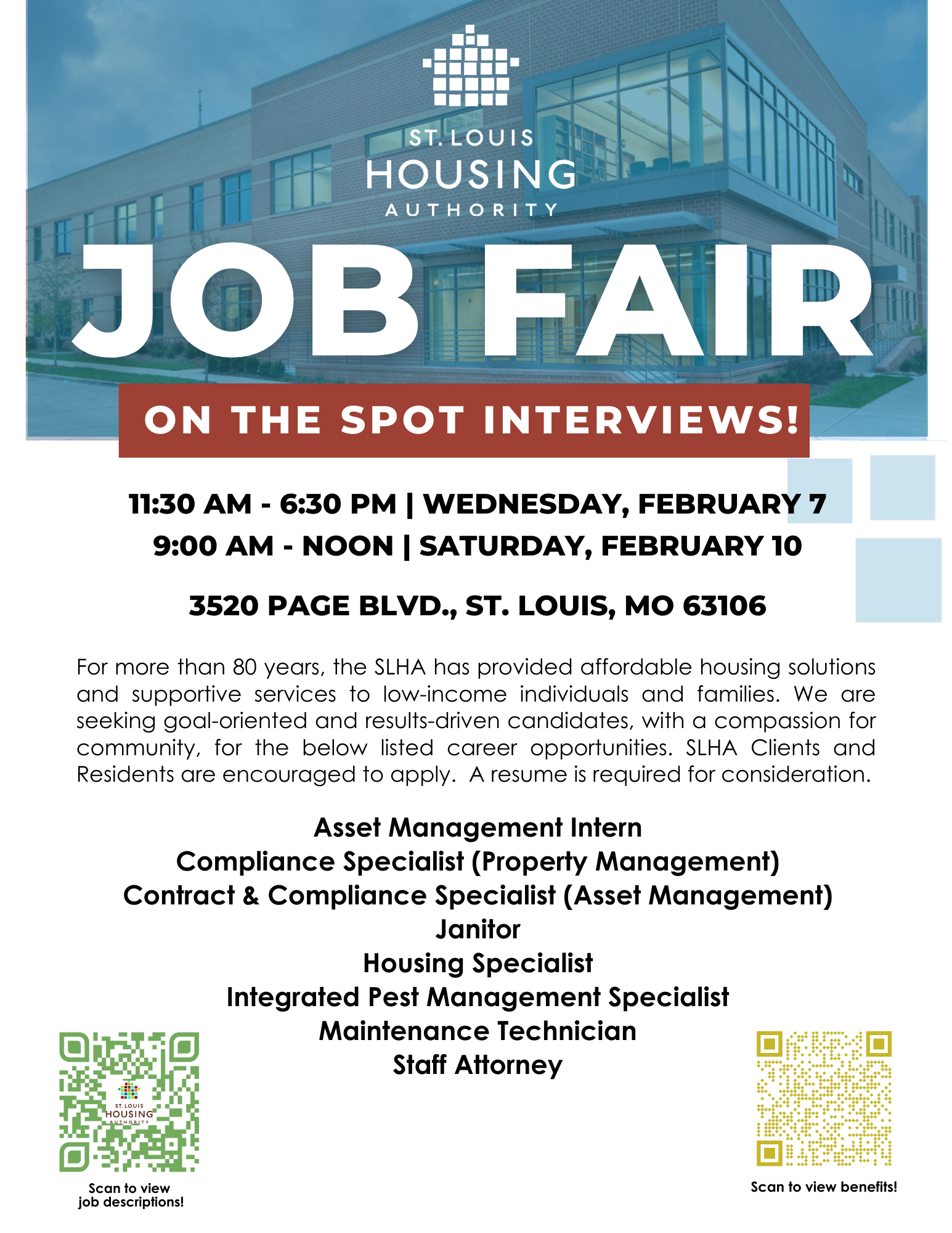 Click here to view the complete job descriptions. To learn more about our competitive benefits package, click here. For more information, call 314-531-4770.